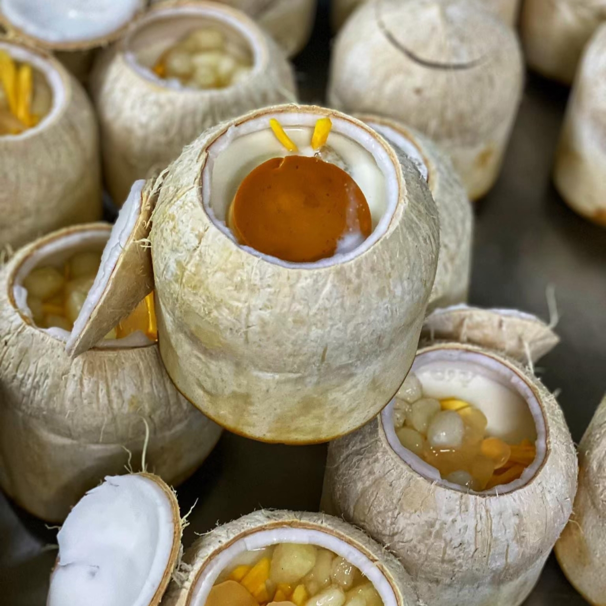 Chè trái dừa gồm có rau câu dừa - thạch củ năng - mít - nhãn - flan - nước cốt dừa kem sữa ướp lạnh ăn đã lắm