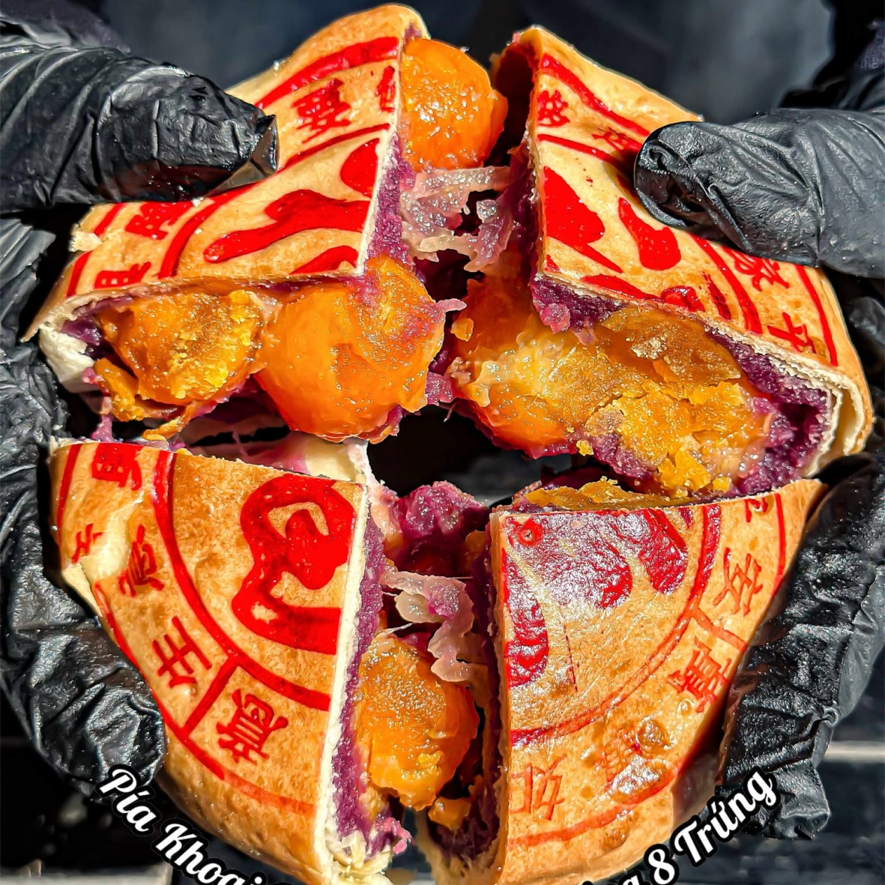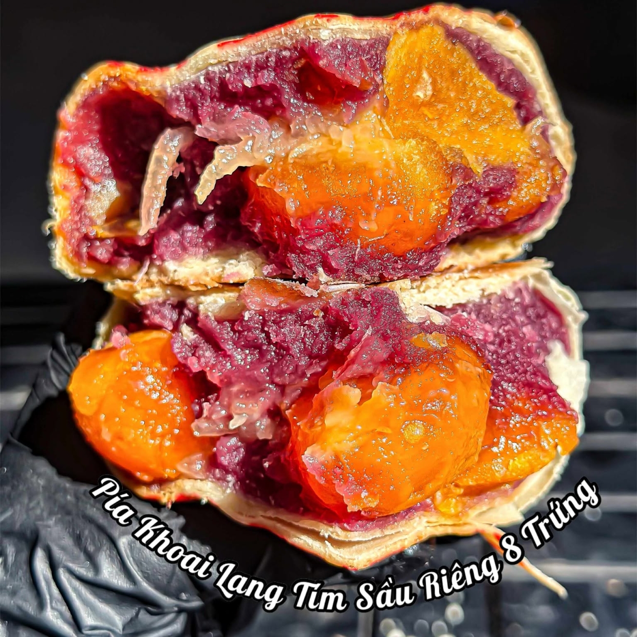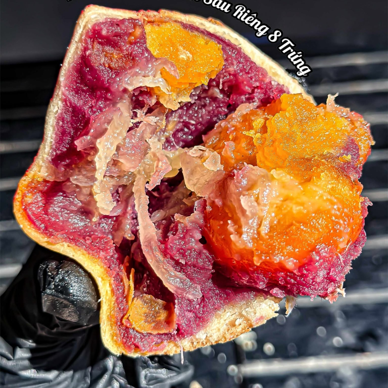Lớp vỏ tím dịu nhẹ từ khoai lang, hòa quyện cùng nhân sầu riêng thơm nhẹ, xen kẽ trứng muối đậm đà – tổng cộng đến 8 trứng trong mỗi chiếc bánh.